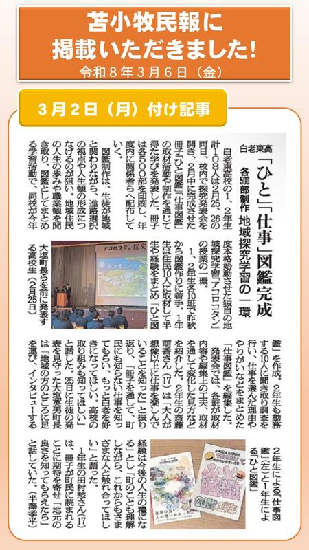 今年度のアコロコタン(総合的な探究の時間)で作成した1,2年生の図鑑が、苫小牧民報に掲載されました!